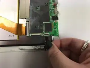 С помощью пластикового инструмента для открытия приподнимите чёрный фиксирующий язычок, который удерживает ZIF-ленточный разъём дисплея на материнской плате.