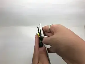 С помощью пластикового инструмента для открытия приподнимите чёрный фиксирующий язычок, который удерживает ZIF-ленточный разъём кнопок громкости и питания на материнской плате.