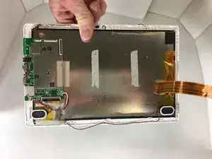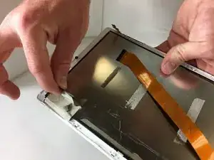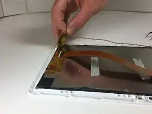 Отклейте серую сетчатую ленту, которая удерживает ленточный кабель сенсорного дигитайзера к переднему корпусу.