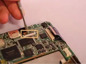 Каждый разъём с нулевым усилием вставки (ZIF) имеет защёлку, фиксирующую ленточный кабель. Кабель камеры (a) и кабель ЖК-экрана (b) имеют защёлку, которая поднимается, как показано на иллюстрации. Используйте лопаточку, чтобы аккуратно приподнять защёлку и освободить кабель.