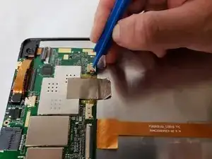 Используйте инструмент для поддевания, чтобы перевести вверх разъем гибкого кабеля ЖК-экрана. Гибкий кабель должен ослабнуть. Снимите кабель, потянув наружу.