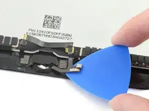 Вставьте плоскую часть лопатки под кронштейн кабеля дисплея и приподнимите, чтобы отсоединить контактный разъём питания от логической платы.