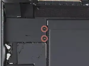 Отверткой Phillips отвинтите два винта длиной 1,3 мм, фиксирующие кронштейн кабеля дисплея.