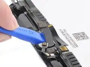 Используйте заострённый конец лопатки, инструмент для вскрытия или ноготь, чтобы поддеть и откинуть маленькую шарнирную запорную планку на ZIF-разъёме сборки кнопки «Домой» ZIF connector.