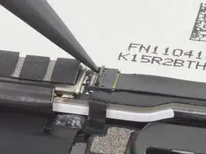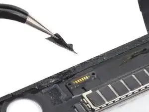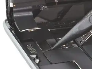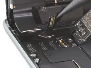 Используйте пинцет, чтобы вытащить защёлку крепления кабеля дисплея из-под края рамки.