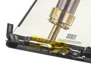 Поверните два инструмента на верхнем крае iPad, чтобы разорвать последние участки клея, держащие сборку дисплея.