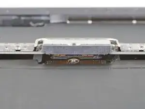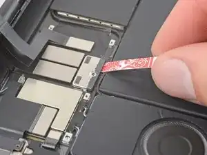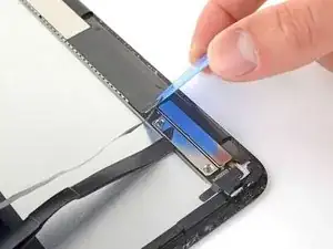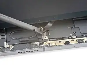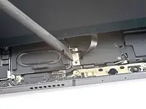 Используйте медиатор, чтобы снять небольшой участок верхнего кабеля дисплея, прикреплённый к кронштейну.