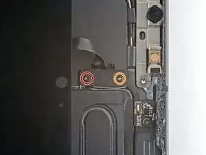 Отвинтите два винта Phillips длиной 1.2 мм, крепящие кронштейн кабелей дисплея.