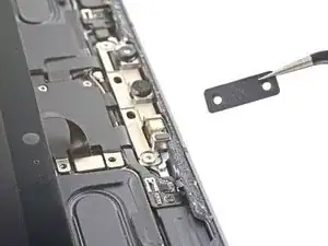 С помощью пинцета снимите нижний кронштейн кабелей дисплея.