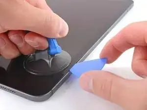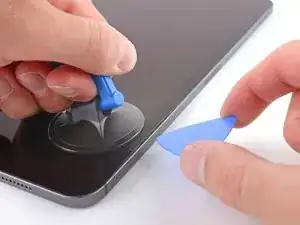 Поднимайте присоску вверх с ровным постоянным усилием, чтобы создать зазор, достаточный для вставки медиатора не более чем на 5 мм в iPad.