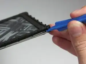 В каждом углу используйте синий пластиковый инструмент для вскрытия, чтобы отщёлкнуть и отделить переднюю панель от клея.