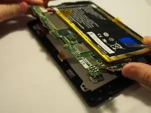 После удаления винтов и шлейфов, воспользуйтесь нейлоновой лопаткой, чтобы аккуратно снять плиту, удерживающую остальные компоненты, и отложить её в сторону.