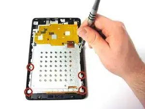 Открутите четыре серебристых винта T5 Torx длиной 2 мм, крепящие экран к рамке.
