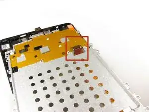 Через металлическую пластину проходит оранжевая лента, соединённая с материнской платой. При снятии пластины аккуратно маневрируйте вокруг ленты и следите, чтобы не растянуть и не порвать её.