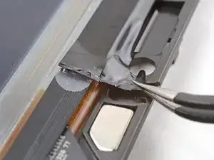 Используйте пинцет с притуплёнными концами, чтобы захватить угол кабеля дисплея, ближайший к разъёму зарядки.