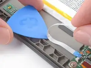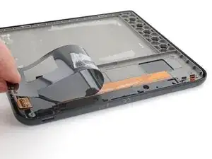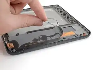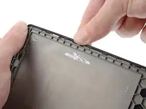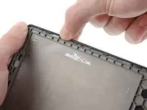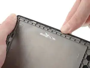 Нанесите разогретый iOpener на пластиковый буфер материнской платы на 90 секунд, чтобы размягчить клей, удерживающий его на рамке.