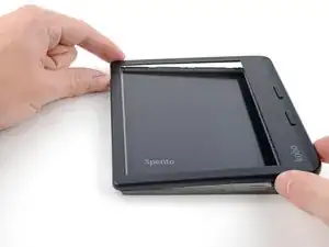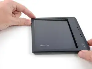 Держите ридер так, чтобы большие пальцы могли нажимать снизу на переднюю крышку, отщёлкивая её с защёлок, а остальные пальцы тянуть экран в противоположную сторону.