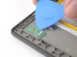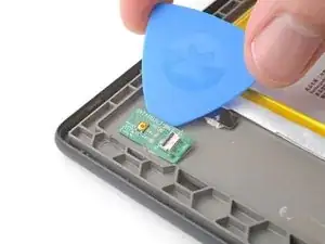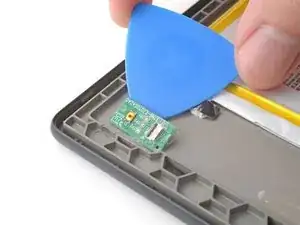 Подденьте лезвие для поддевания под центр платы кнопки питания и отожмите оставшийся клей.