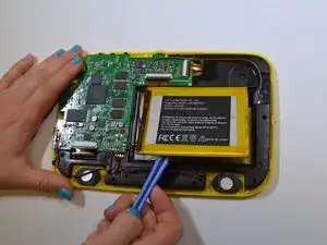 Аккумулятор приклеен к черной пластиковой поверхности. Используйте пластиковый инструмент для открытия, чтобы приподнять аккумулятор от черного пластика.