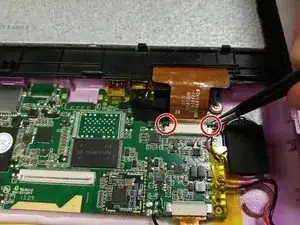 Используйте пинцет, чтобы разблокировать черные штифты (обведены красным), которые соединяют ленту экрана LCD с материнской платой.