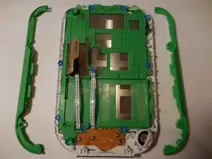 Удалите винт 7 мм справа от разъёма картриджа, два винта 8 мм в верхнем левом углу и девять винтов 8 мм, удерживающих зелёную оболочку.