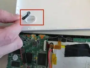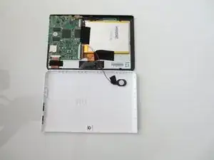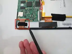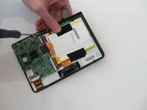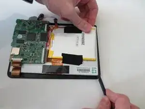 Используйте тупой конец лопатки, чтобы снять плату и аккумулятор с части устройства, которая приклеена к стеклу экрана.