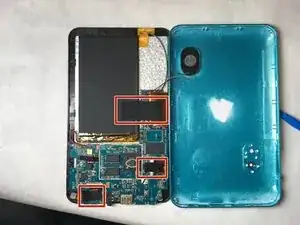 Осторожно отодвиньте ленту от аккумулятора, от микросхемы в нижнем левом углу и от гибкого кабеля в нижней правой части платы. В нижнем левом углу находится небольшой серебристый квадратный компонент, который также нужно отщёлкнуть и освободить от ленты.