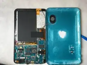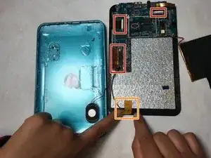 При разборке держите порты ввода-вывода к себе и поворачивайте заднюю крышку вправо. К динамику подведён короткий провод, соединяющий его с платой.