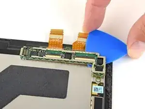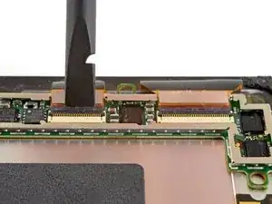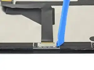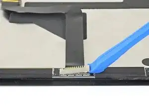 С помощью лопатки отогните маленькие фиксирующие язычки на ZIF-разъёмах кабелей дисплея.
