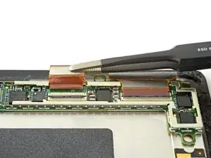 Используйте пинцет, чтобы выдвинуть кабели дисплея прямо из их гнёзд на плате дисплея.