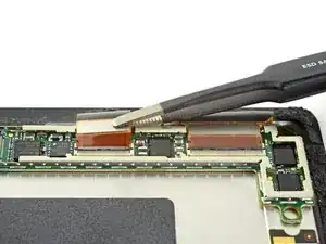 Вставьте кончик острого пинцета в зазор на кромке экранирующей пластины EMI, покрывающей разъём дигитайзера.