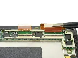С помощью лопатки поднимите маленькие фиксирующие язычки на ZIF-разъёмах кабелей дисплея.