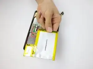 Поднимите белую ленту пальцами, затем отведите желтую ленту, удерживающую удлинитель батареи.