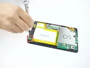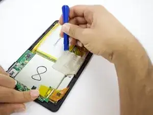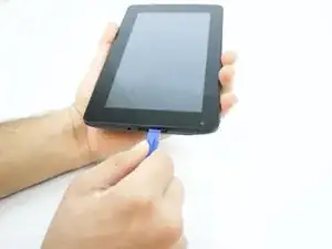 Вставьте монтажный инструмент iFixit между корпусом и дисплеем планшета в нижней части устройства, где находится разъем для зарядки.