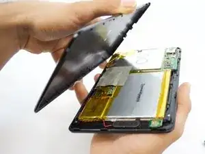 Осторожно отожмите корпус планшета и отведите заднюю крышку.
