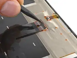 Используйте пинцет, чтобы оторвать и снять чёрную ленту с разъёма кабеля экрана.