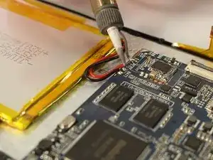 Используйте паяльный инструмент, чтобы отпаять 3 провода от материнской платы к батарее (чёрный, красный, серый).