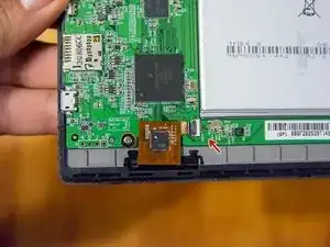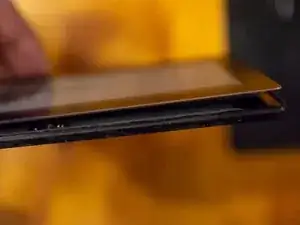 Отделите экран от средней панели; экран также приклеен лентами. Можно сохранить ленты для установки на новый экран. После снятия экрана установите новый экран и подключите кабели. Затем наденьте заднюю крышку. Будьте осторожны, чтобы не потерять кнопку питания.