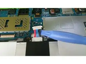 После того как все 10 винтов ослаблены и удалены, приподнимите один край аккумулятора пластиковым инструментом. Отсоедините провод от платы, нажав на маленький белый фиксатор в месте подключения. Аналогичным образом снимите остальные провода на устройстве. После отключения проводов аккумулятор можно безопасно вынуть.