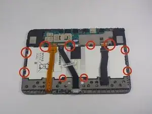 В центре устройства Вы увидите большой белый прямоугольник с маленьким шлейфом — это аккумулятор. По краю аккумулятора расположены 10 маленьких винтов. Снимите винты с помощью отвертки, поворачивая её против часовой стрелки.