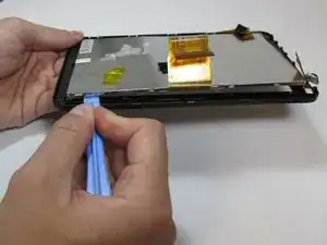 Используя пластиковый инструмент для вскрытия, начните отделять передний экран от дисплея