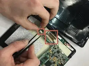 Отсоедините материнскую плату от экрана: выньте входной разъём слева, отмеченный красным, а также аккуратно отсоедините шлейф от экрана, отмеченный красным посередине.