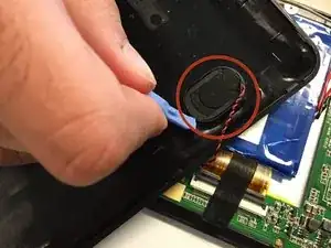 После открытия планшета используйте пластиковый монтажный инструмент, чтобы снять динамик на задней панели. Это позволит правильно разъединить обе половины корпуса планшета.