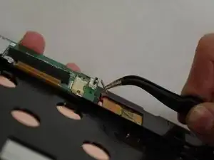 Используя пинцет с тонкими носиками, аккуратно выдвиньте маленький белый разъём проводов (красный/чёрный провода) из его гнезда.