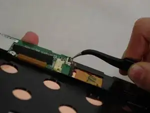 Используя пинцет с тонкими носиками, аккуратно поднимите тёмно-серую крышку справа от устройства, удерживающую малую оранжево-золотистую ленточную шлейфовую ленту. (Ширина примерно 1/4 дюйма.)