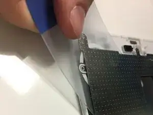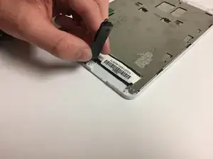 Вставьте пластиковый инструмент для вскрытия между задней панелью и передней частью планшета и аккуратно подденьте панель, отойдя от планшета.