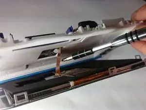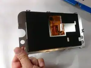 После удаления шплинтов экран должен ослабнуть в рамке и оставаться подключённым только коричневой плёнкой, показанной на фотографии.