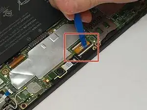 С помощью синего инструмента для вскрытия отделите пластиковую заднюю крышку от устройства. Начните с угла и продвигайтесь по периметру планшета.