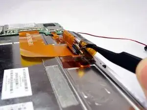 Снимите меньший ленточный кабель, аккуратно перевернув чёрный фиксатор и вытащив кабель пинцетом.