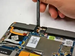 Используйте лопатку, чтобы отсоединить шлейф от верхней камеры, поддев разъем и оттолкнув его от платы.